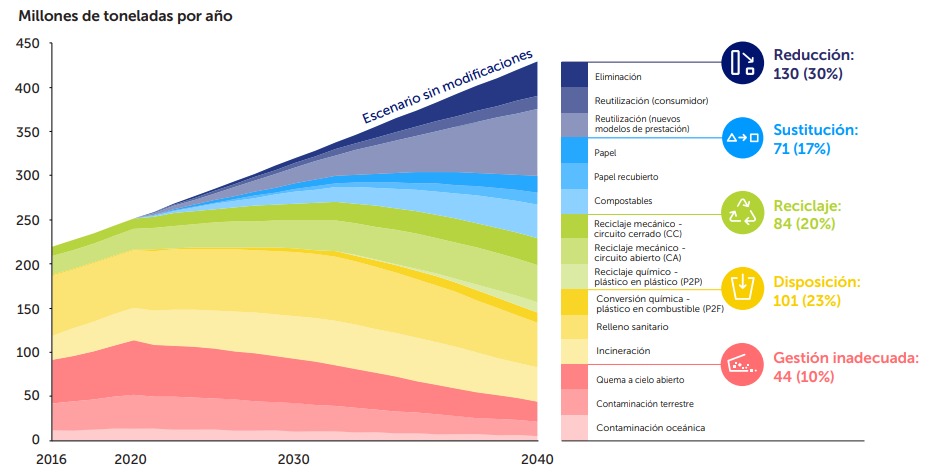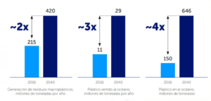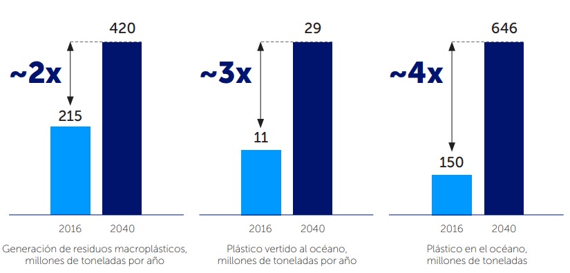 El informe Breaking the Plastic Wave señaló que en un escenario sin tomar alguna medida o Business As Usual (BaU), la existencia de residuos plásticos que son gestionados inadecuadamente se incrementará de 91 millones de toneladas en el año 2016 hasta aproximadamente 239 millones de toneladas al año 2040 (2.6 veces la cantidad de residuos plásticos existentes). Adicionalmente, el informe menciona que en ese mismo periodo, la generación de residuos plásticos se duplicará, en tanto que la cantidad de plástico vertido al océano prácticamente se triplicará y la cantidad de plásticos existente en los océanos superará el cuádruple para el mismo periodo evaluado (figura 1).