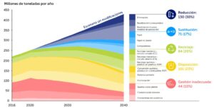 Como se observa, es posible una reducción del 40% de residuos de plástico (parte baja de la cadena) a partir de la gestión adecuada de residuos sólidos y una reducción de hasta el 30% de residuos de plástico mediante la eliminación de la producción y el consumo, la reutilización y la implementación de nuevos modelos de prestación que sustituyan al plástico (parte alta de la cadena).